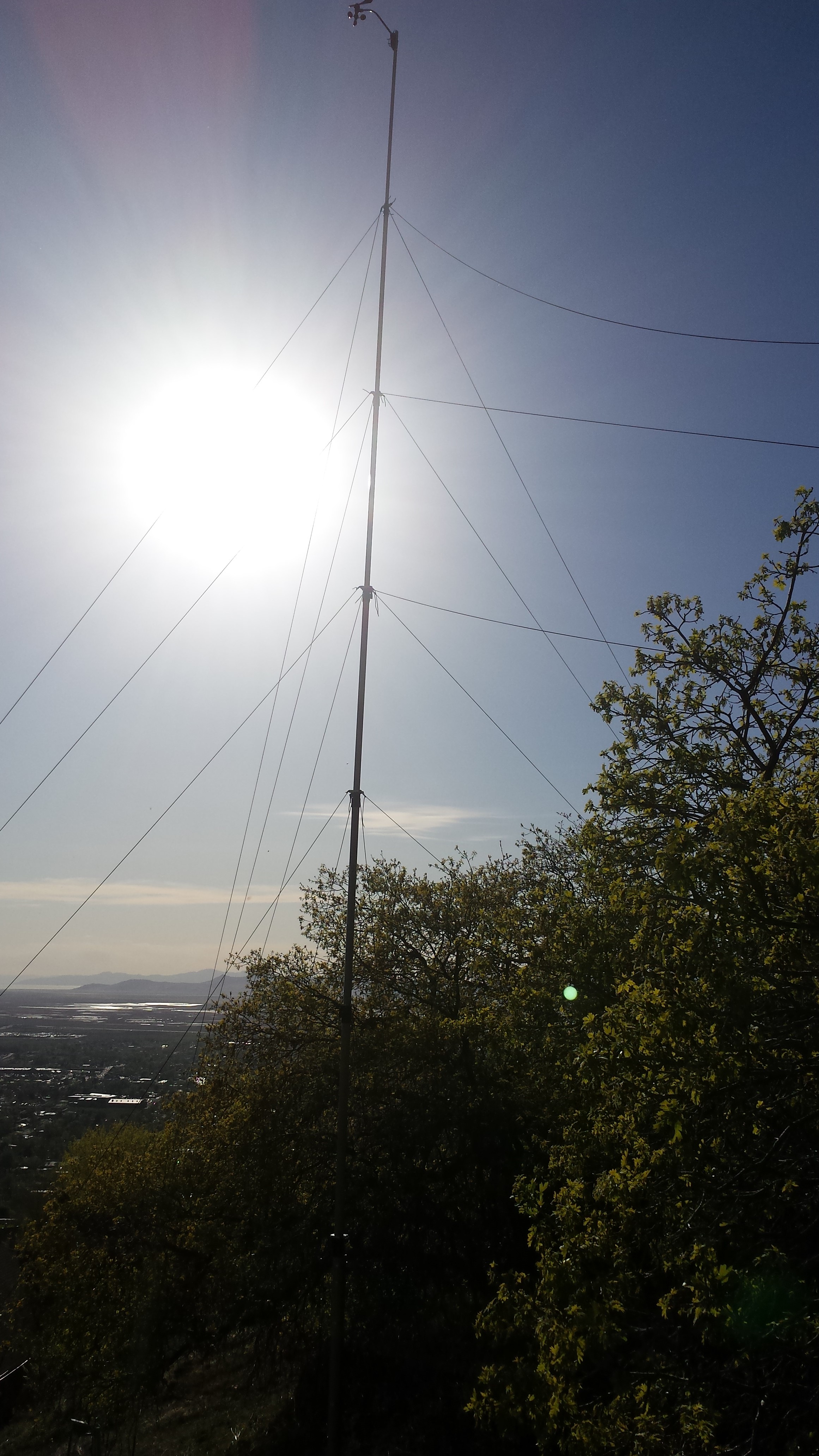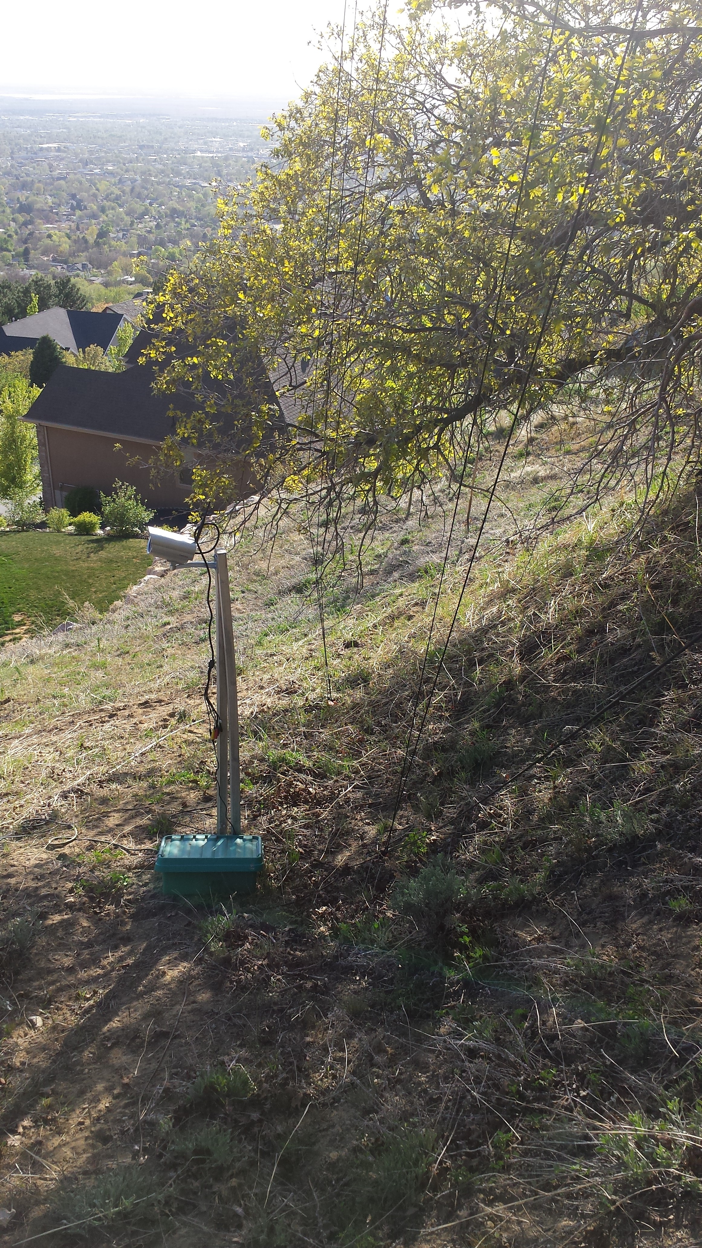 ![]() The setup as of April 2015. Just finished installing the new wind sensor on a fiberglass pole. The pole is 10m high (about 33ft), the official height for measuring wind. It sits well above the scrub oak, and has a perfect exposure to the East (Downslope windstorms) and S/SW well above the roofline of the houses below. ![]() This pole is supported by 24 guy wires on 6 guy rings. The pole was purchased from http://www.mgs4u.com/fiberglass-push-up-mast.htm#telescoping and is the MK-6-HD model. Guy rope and rings were also purchased from this company. ![]() The SE facing camera is just below the pole. ![]() A view of the guy ropes. The pole is actually pretty darn straight. ![]() But a slight bend can be observed from underneath. There is very little give in this pole, it feels sturdy. ![]() I have 8 anchors in the ground, each with 3 guy ropes. They radiate in four directions from the pole, one a shorter distance than the other for the lower guy ropes. ![]() East. ![]() Southeast. ![]() South. ![]() Southwest. |